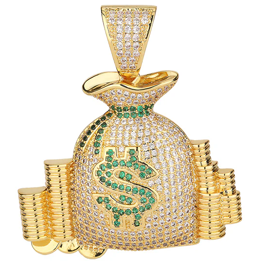 Flash your flair with this iced-out Money Bag Pendant, a bold gem in wholesale jewelry. Covered in brilliant stones and shaped like a money sack overflowing with stacks of coins, it’s the perfect symbol of hustle, ambition, and success. This eye-catching gold-plated pendant brings shine and style to any outfit, whether on the street or in the spotlight. It is ideal for retailers or fashion-forward individuals looking to add serious drip to their collection without losing the attitude.