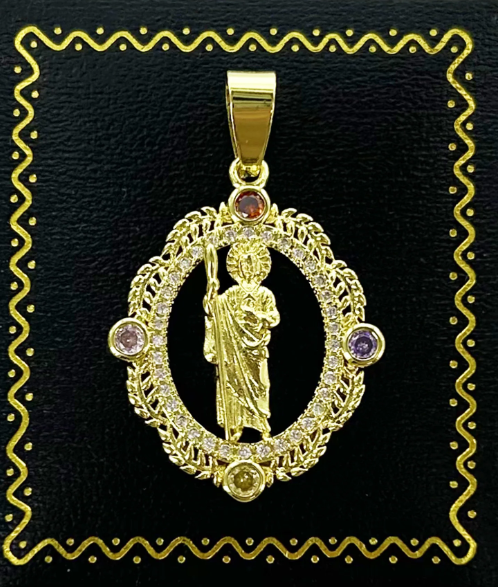 Stand out with this radiant San Judas Pendant — a powerful symbol of faith wrapped in style. Featuring a detailed Saint Jude figure at the center, this piece shines with its ornate oval frame and multi-colored stones. Made for believers and trendsetters alike, it’s part of our stunning collection of gold-plated pendants. Whether gifting or collecting, this pendant brings beauty and meaning together. Ideal for daily wear or special occasions, this pendant blends personal style with a powerful symbol of faith.