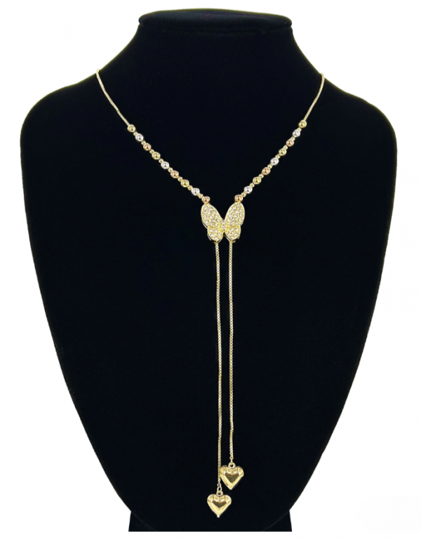 Add a pop of charm and sparkle with this tri-color Butterfly Necklace from Kaash Jewelry. Featuring a mix of golden, silver, and rose tones, this piece adds playful elegance to your fashion jewelry collection. The glittering butterfly centerpiece steals the spotlight, while the twin heart drops bring a touch of romance to your neckline. Perfect for day or night, this necklace blends color and shine in a way that feels fresh and fun. Whether you're gifting it or wearing it out, this piece brings a unique glow to your style without trying too hard.