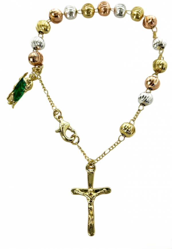 Carry your faith in style with this San Judas Hand Rosary, designed for daily devotion and personal fashion. Featuring tri-tone beaded detailing, a bold Cross Charm Medallion, and a vibrant green San Judas charm, this piece brings spiritual meaning into the world of fashion jewelry. Its compact design makes it easy to keep close, whether worn on your wrist or held during prayer. Perfect for those who love jewelry with purpose, it blends beauty and belief in one unique accessory.
