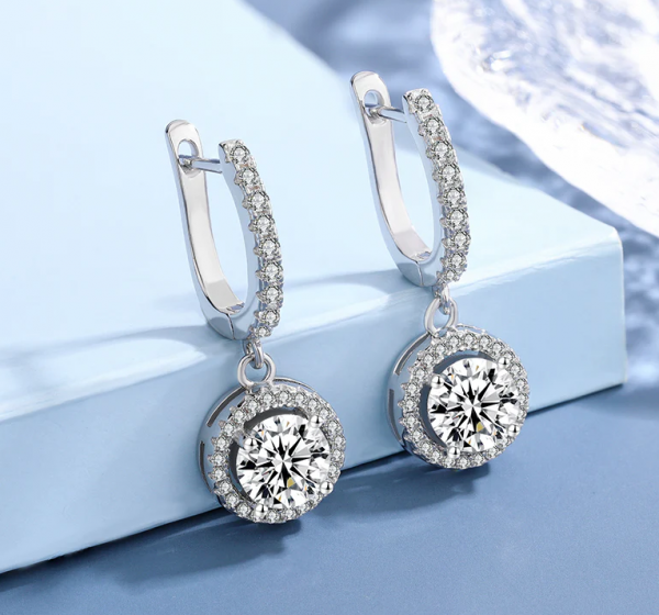 Let your glow speak volumes with these 925 Sterling Mossanite Hughes 1.0 Carat earrings. Set in polished 925 Sterling Silver jewelry, each piece dazzles with a brilliant round-cut center framed by shimmering accents. The graceful drop design brings movement and sparkle, catching the light with every turn. Whether paired with casual or formal wear, these earrings make an instant impact. Designed for those who appreciate striking detail and clean, radiant style, they offer a bright finish to your jewelry collection—classic, confident, and ready for any occasion.