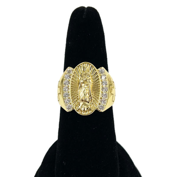 This striking Guadalupe Ring brings faith and fashion together with bold detail. Featuring a radiant gold finish, it highlights the iconic Virgin of Guadalupe at the center, framed by sparkling White Color CZ Stones for a brilliant shine. Perfect for daily wear or special occasions, this ring blends meaning with style. Designed as part of our gold-plated rings collection, it is available in sizes 7 to 9, making it an ideal choice for a personal statement or a meaningful gift.