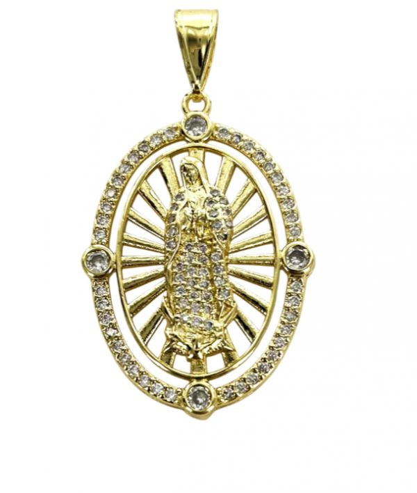 The Guadalupe Pendant is a beautiful symbol of faith and devotion, designed to be a cherished accessory. This striking piece features a detailed depiction of Our Lady of Guadalupe, encircled by sparkling cubic zirconia stones. The vibrant gold finish provides a radiant glow, making this pendant a standout item in any jewelry collection. Its oval design is both traditional and elegant, suitable for wearing on special occasions or as a daily reminder of your beliefs. This pendant is a truly special item, perfect as a gift for a loved one or a meaningful addition to your own personal style.