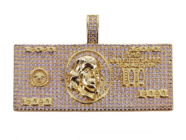 This $100 bill pendant shows a bold money design with fine details. It gives a strong street look and shines nicely with daily wear. Good for chain styling and trendy fashion.